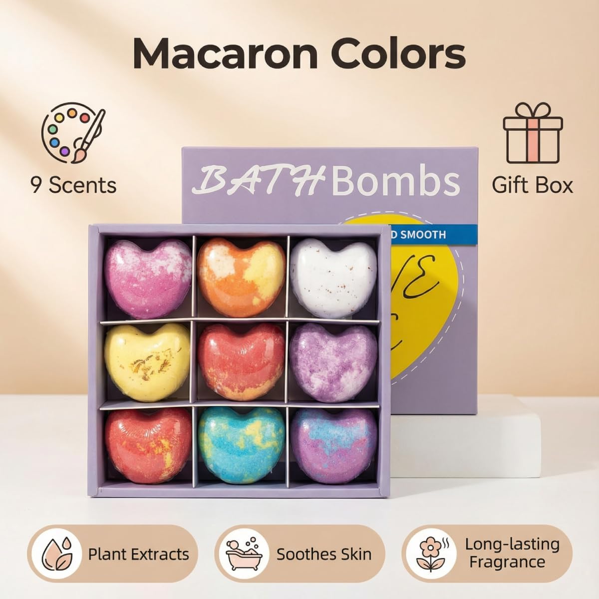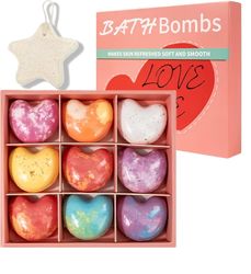 Our moisturizing bath fizzies are 1.41oz / 40g each (Size close to a tennis ball). Set of 9 Bath Bomb has been designed in a gift box. Experience all the pleasures of a SPA treatment directly from home. Better with bath pillow and bathtub caddy tray. Bath bombs are the unique surprise for your Dad, Mom, friends and special someone. Including Valentine's Day, Mother's Day, Thanksgiving, Christmas, New Year, Birthdays, Anniversary, Graduations etc. Contains premium essential oils for more remarkable skin including lavender, rose and green tea; citric acid deeply purifies skin and helps prevent blackheads & acne; promotes micro-circulation with anti-aging benefits. Our bath fizzy revitalize and nourish your skin with the help of the skin loving oils and are colored with all natural ingredients from the earth. Enjoy a relaxing bath with beautiful organic soothing Bath Balls.